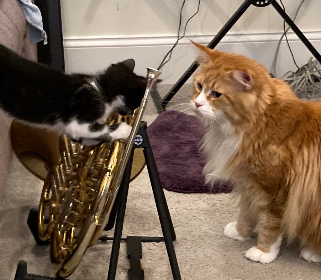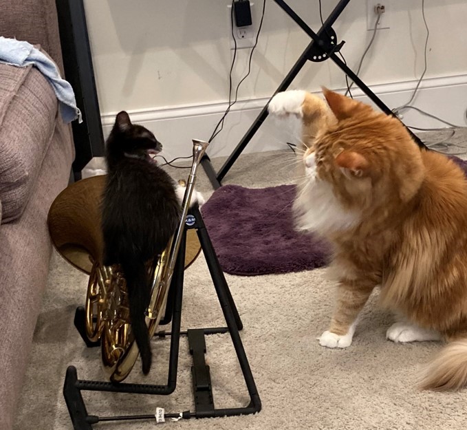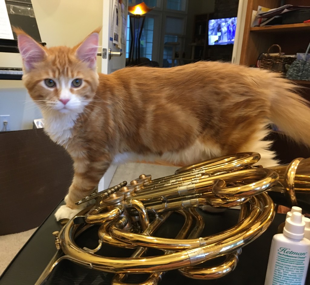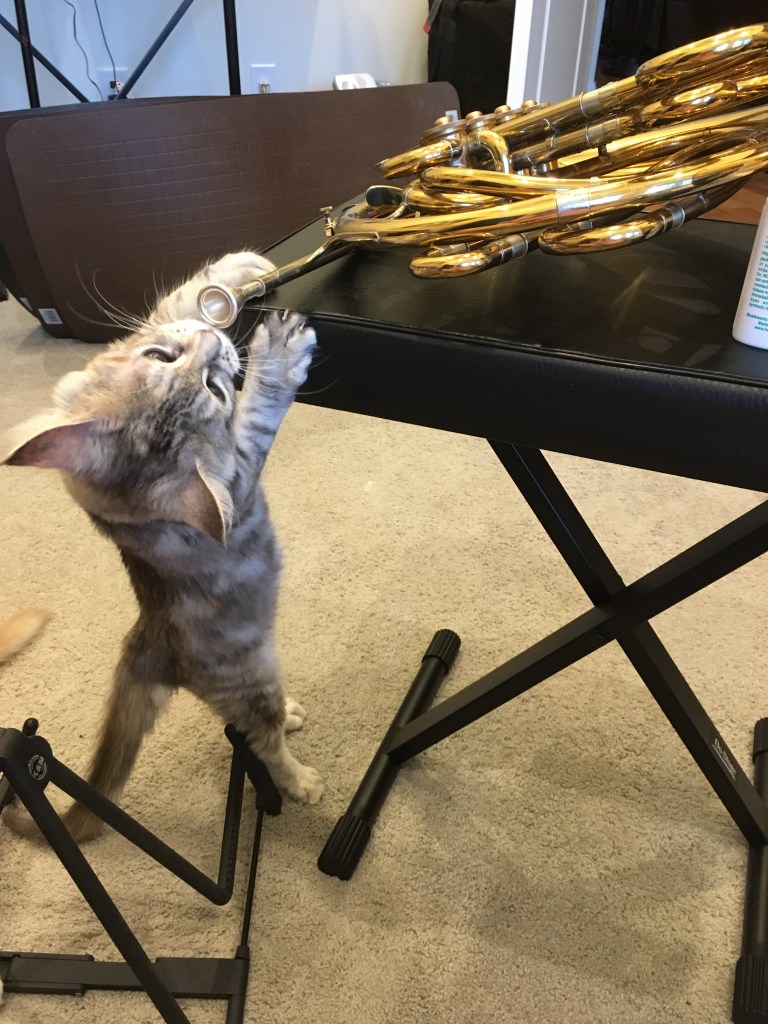 Waffle the kitten tooting on my LawsonMoose: “Waffle, let me teach you how to play that thing.”Moose: “Waffle, you cracked that High G!!!!”Rocky: “Mom, I’m going to perform Strauss 1!!”Moose the kitten: “Mom, how many of these valves do I have to push down to play a high A??”